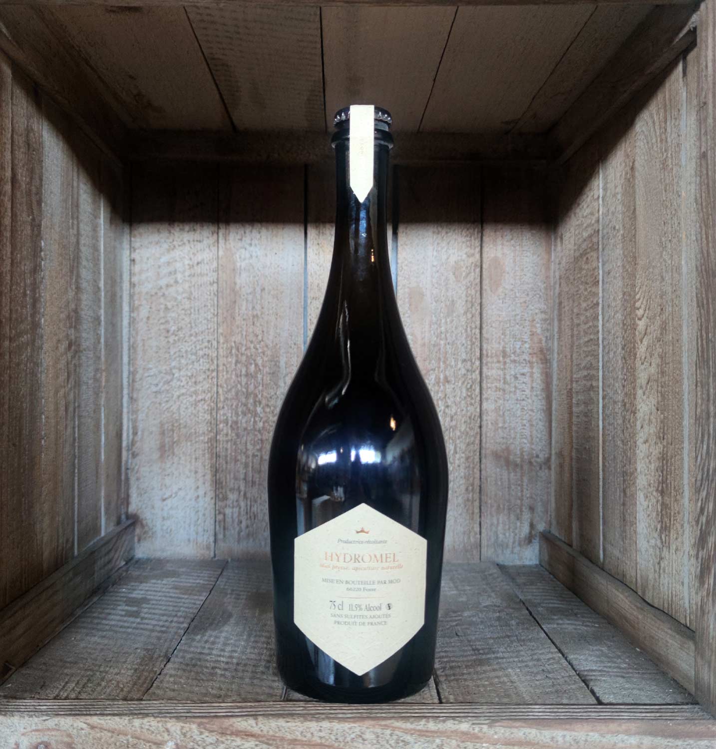 Composition: eau, 40% miel (entre 300 gr. et 400 gr. par bouteille), levures, sans sulfites ajoutés.